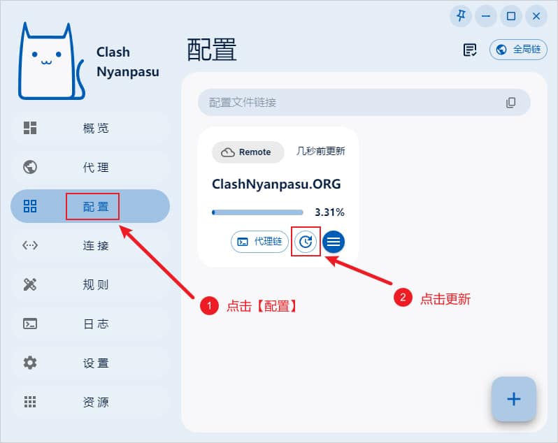 点击界面左侧菜单 配置,点击 更新图标 即可更新所有配置文件,如下图所示。