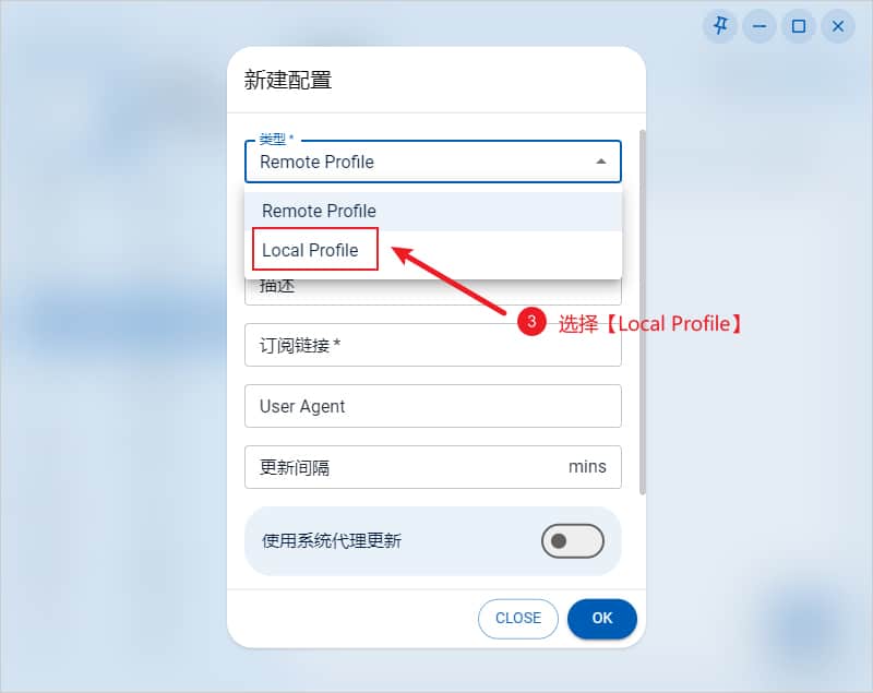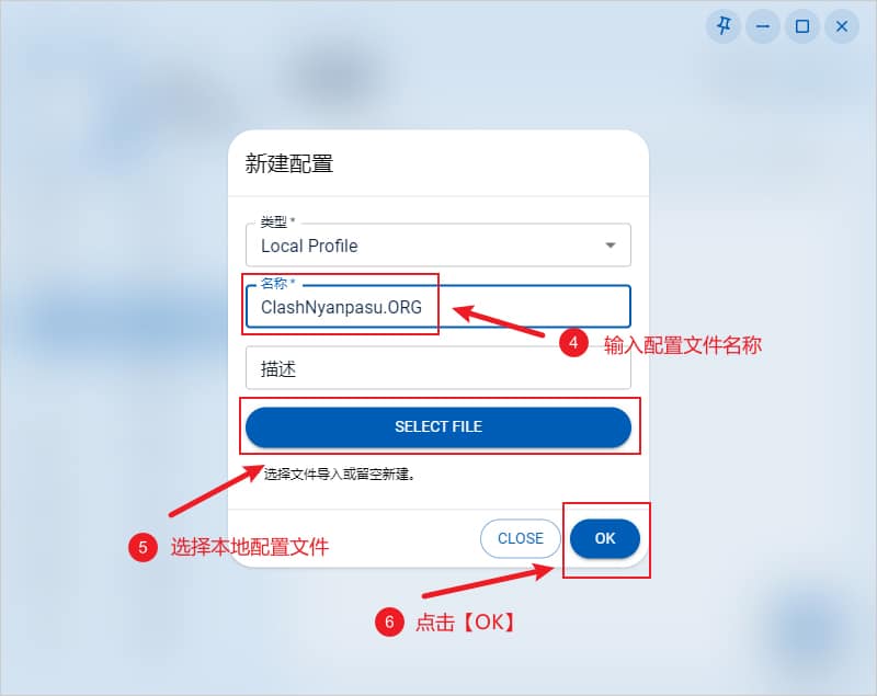 输入配置文件名称后选择 SELECT FILE 选择本地配置文件,最后点击 OK 添加本地配置文件,如下图所示。