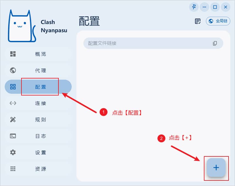 本地配置文件即通过本地文件拖拽导入,一般为无法通过远程订阅地址导入的情况下使用,可尝试在浏览器中下载配置文件后,点击左侧菜单 配置,点击右下角➕图标,如下图所示。