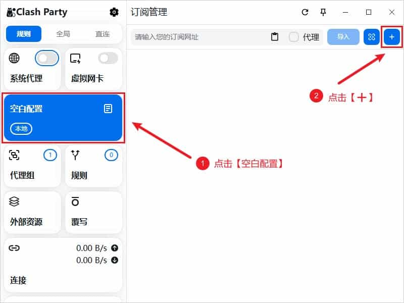 本地配置文件即通过本地文件拖拽导入,一般为无法通过远程订阅地址导入的情况下使用,可尝试在浏览器中下载配置文件后,点击左侧菜单空白配置,点击➕按钮,如下图所示,选择打开随后在弹出的窗口选择本地配置文件即可。