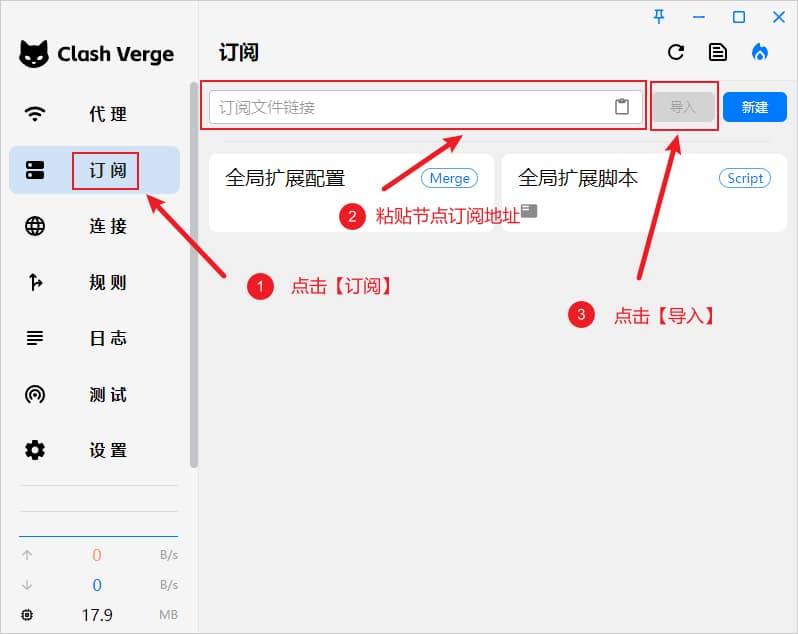 本地配置文件即通过本地文件拖拽导入,一般为无法通过远程订阅地址导入的情况下使用,可尝试在浏览器中下载配置文件后,点击左侧菜单订阅,点击新建按钮,如下图所示。