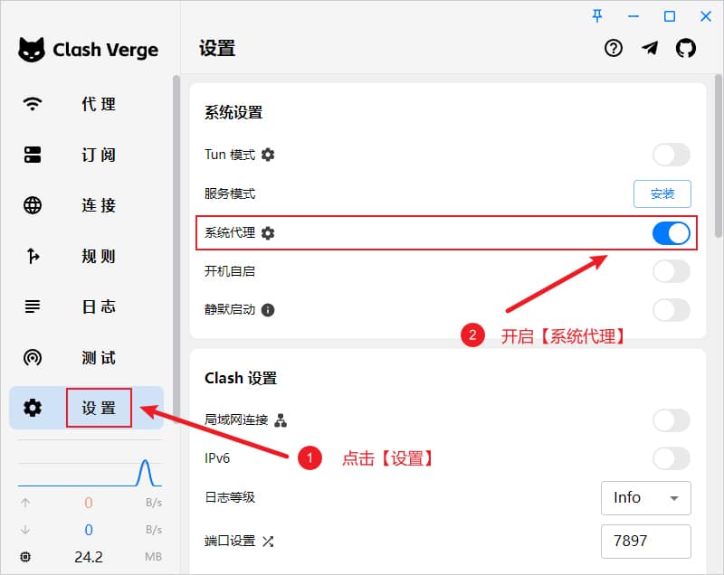 启用系统代理,需要点击界面左侧菜单设置选项卡,找到系统代理并开启开关即可,开启状态下按钮状态为蓝色,如下图所示为开启状态。